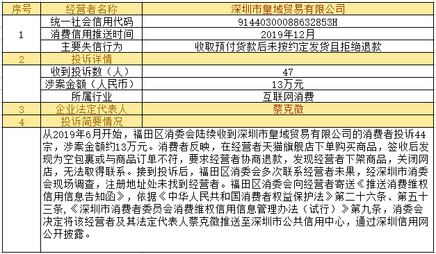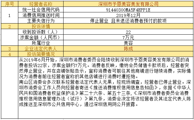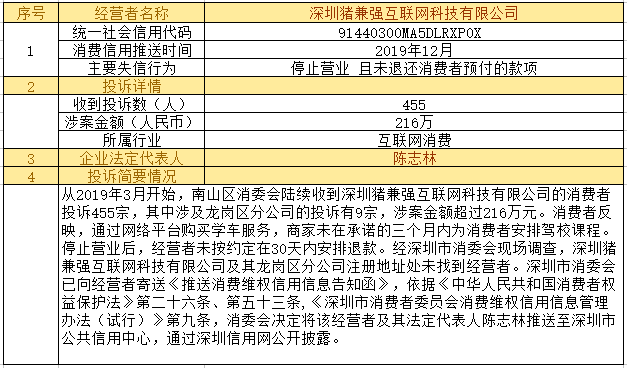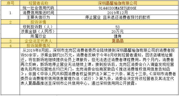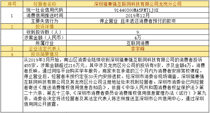 深圳新聞網(wǎng)2019年12月24日訊12月24日,為加強對商品和服務的社會監(jiān)督,推進消費領域信用體系建設,深圳市消費者委員會(以下簡稱“深圳市消委會”)聯(lián)合福田區(qū)消費者委員會(以下簡稱“福田區(qū)消委會”)和龍崗區(qū)消費者委員會(以下簡稱“龍崗區(qū)消委會”)將深圳豬兼強互聯(lián)網(wǎng)科技有限公司、深圳市皇域貿(mào)易有限公司、深圳市百家順資產(chǎn)管理有限公司、深圳市予恩美容美發(fā)有限公司、深圳晶馨瑜伽有限公司等五家預付式和互聯(lián)網(wǎng)消費領域停止營業(yè)且未退還消費者預付款項的經(jīng)營者及其主要負責人推送至深圳市公共信用中心,通過深圳信用網(wǎng)公開披露。