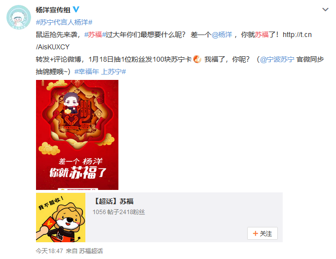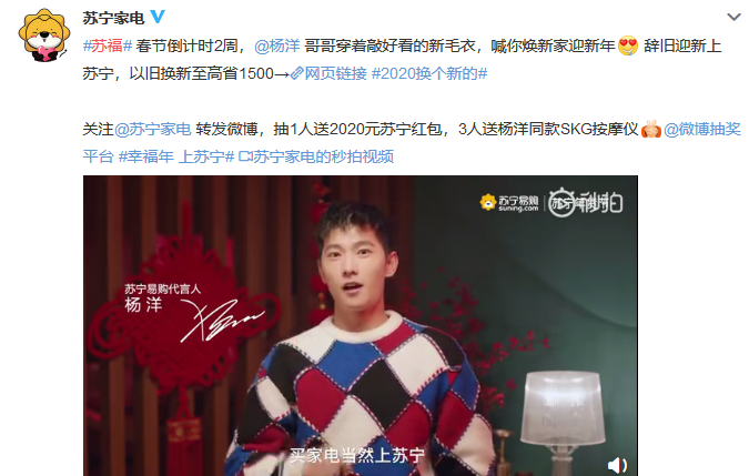 蘇寧代言人楊洋和江疏影也給大家?guī)砹瞬簧俑@?,粉絲們繼續(xù)喊話愛豆,“過年就差一個(gè)楊洋了,萬一實(shí)現(xiàn)了呢”。蘇寧家電直接開啟鼠運(yùn)來襲模式,粉絲參與微博互動(dòng),就有機(jī)會獲得2020元蘇寧紅包,還能獲得楊洋同款SKG按摩儀。