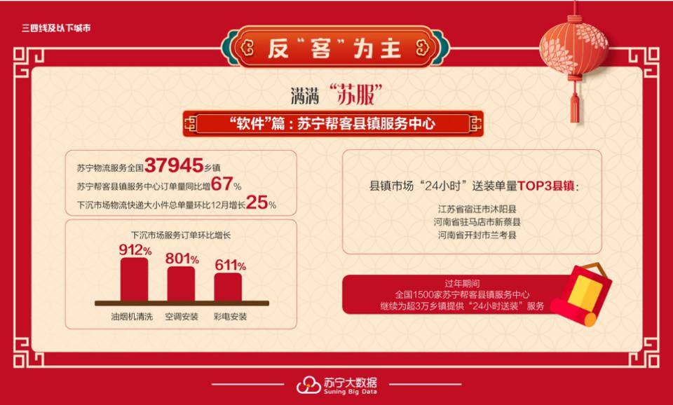 蘇寧物流數(shù)據(jù)顯示,春節(jié)下沉市場物流快遞大小件總單量環(huán)比12月增長25%。