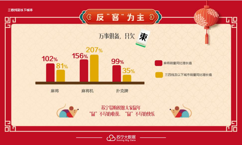 除此以外,春節(jié)作為“熬夜黨”們的主戰(zhàn)場,零食和麻將一直是必備物料,三四線城市在這其中的消費力也有了明顯增長。蘇寧數(shù)據(jù)顯示,零食禮包銷量同比增長137%,三線及以下城市銷量同比增長158%;堅果禮包銷量同比增長142%,三線及以下城市銷量同比增長279%;麻將銷量同比增長102 %,三四線及以下城市銷量同比增長81 %;麻將機銷量同比增長156 %,三四線及以下城市銷量同比增長達到了207 %。