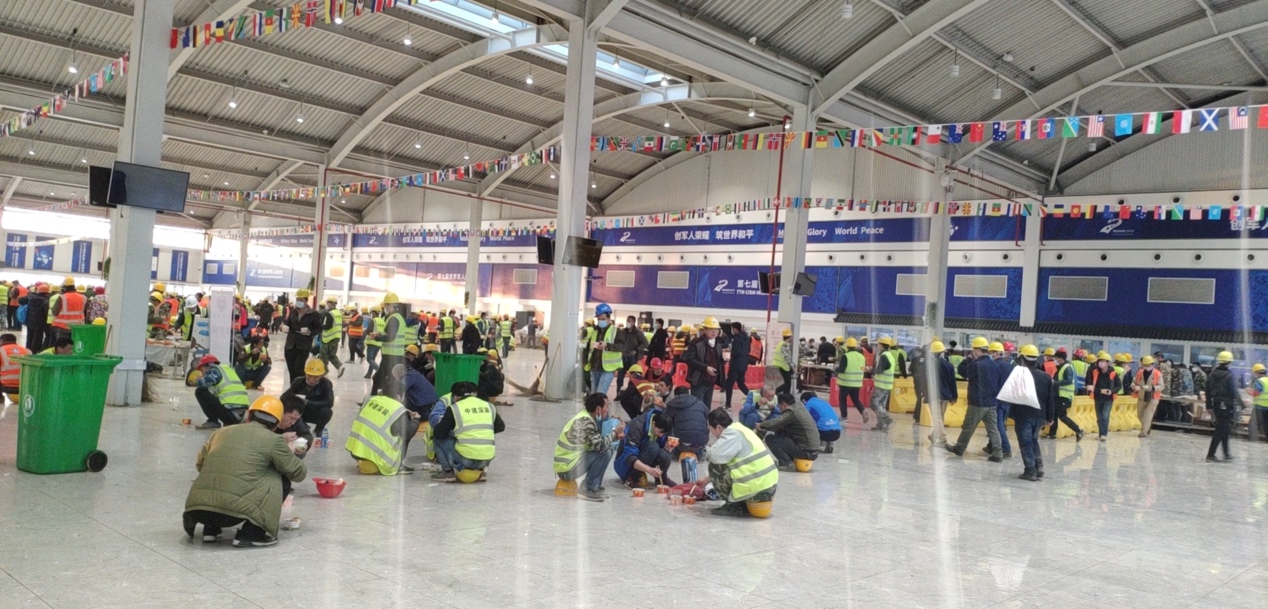 中午就餐時,提醒大家“分開就餐,對疫情時刻保持警惕”的廣播聲不絕于耳。偌大的空地上,不少工人都謹(jǐn)慎地與同事們分開適當(dāng)距離,蹲在地上開始快速用餐。同樣也包括楊杰,“吃飯要保持距離。我們快點(diǎn)吃完,就能快點(diǎn)回去繼續(xù)干?!?/p>