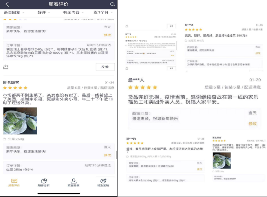 揀貨、核對(duì)訂單、打包、再次確認(rèn)商品無(wú)誤,在規(guī)定時(shí)間內(nèi)將商品給到外賣騎手……這是一項(xiàng)挑戰(zhàn)體力與腦力的“細(xì)致活”。為了維持家樂(lè)?!?公里內(nèi)、1小時(shí)速達(dá)的配送到家”服務(wù)順利運(yùn)作,每天,家樂(lè)福門店的電商主管還需要協(xié)調(diào)不同部門的值班員工通力合作。由于春節(jié)期間人員緊缺,超市一線員工幾乎每天都在與時(shí)間賽跑?!耙圆蛔儜?yīng)萬(wàn)變,在這場(chǎng)戰(zhàn)役中不斷的完善不斷的調(diào)整,每一分每一秒都是十足寶貴的?!秉S福填說(shuō),雖然沒(méi)有回家過(guò)年,但看到顧客們一致的好評(píng)留言,自己心里非常高興?!邦櫩偷暮迷u(píng)就是對(duì)我們工作的最大鼓勵(lì)和認(rèn)可?!?/p>