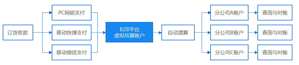而在網(wǎng)站后臺,系統(tǒng)將自動進行一系列復(fù)雜操作:收款后直接根據(jù)預(yù)設(shè)好的規(guī)則,向負(fù)責(zé)廣東區(qū)域的分子公司付款,清分到各分子公司的賬戶。系統(tǒng)提供一套獨立賬戶體系,獨立結(jié)算、清分,收付款分子公司均有不同的查詢對賬后臺,集團總部也可以獨立匯總查詢。