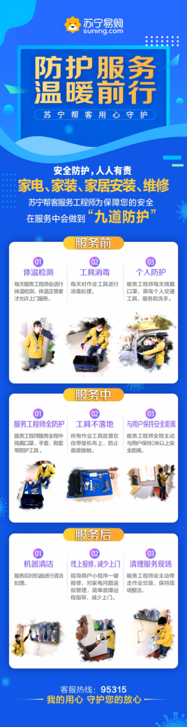 而針對廣大用戶最為關(guān)注的送裝問題,蘇寧家電推出領(lǐng)跑行業(yè)的“九道防護”措施。在堅持服務(wù)不打烊的同時,打消用戶的安全顧慮,保障開倉計劃下的用戶體驗。