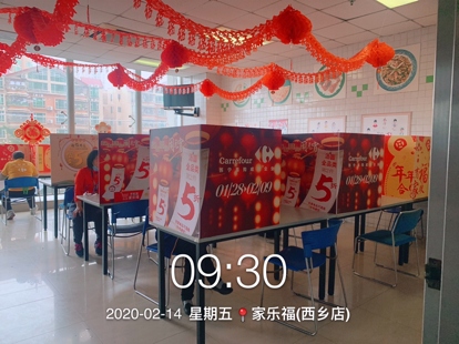 蘇寧家樂福還安排了保潔員每天對員工餐廳按三餐進(jìn)行清潔,使用稀釋的84消毒液浸泡抹布對桌椅進(jìn)行擦拭。其次,在餐廳放置免洗消毒凝膠,供員工用餐前清潔使用。再次,要求員工分時段用餐,自帶餐盒餐具盛飯;每個人在餐廳內(nèi)用餐是也要與他人保持一定距離,并用簡易卡板隔開。