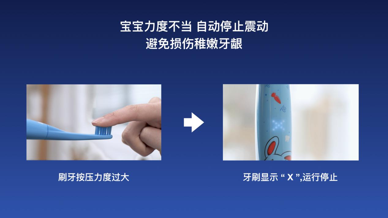 S7000K智能音樂兒童電動牙刷還支持自動過壓降頻保護(hù),當(dāng)孩子在刷牙力度過大時,該功能就會啟動,自動停止振動,屏幕LED還會顯示出X型警告,保護(hù)孩子稚嫩的牙齦及牙釉質(zhì)。