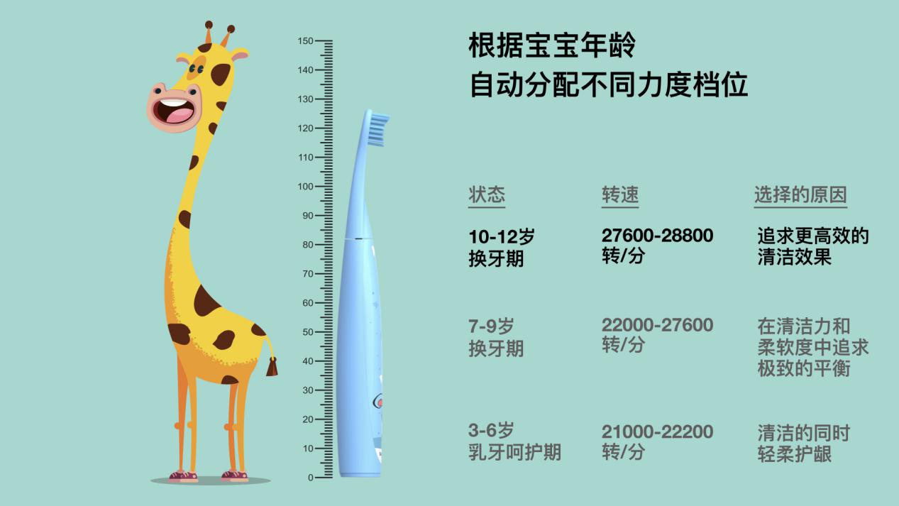 根據(jù)孩子的乳牙期、換牙期以及相應(yīng)年齡段特點,S7000K可以自動分配不同的轉(zhuǎn)速力度檔位功能,分階呵護(hù),讓孩子刷牙放心無憂。