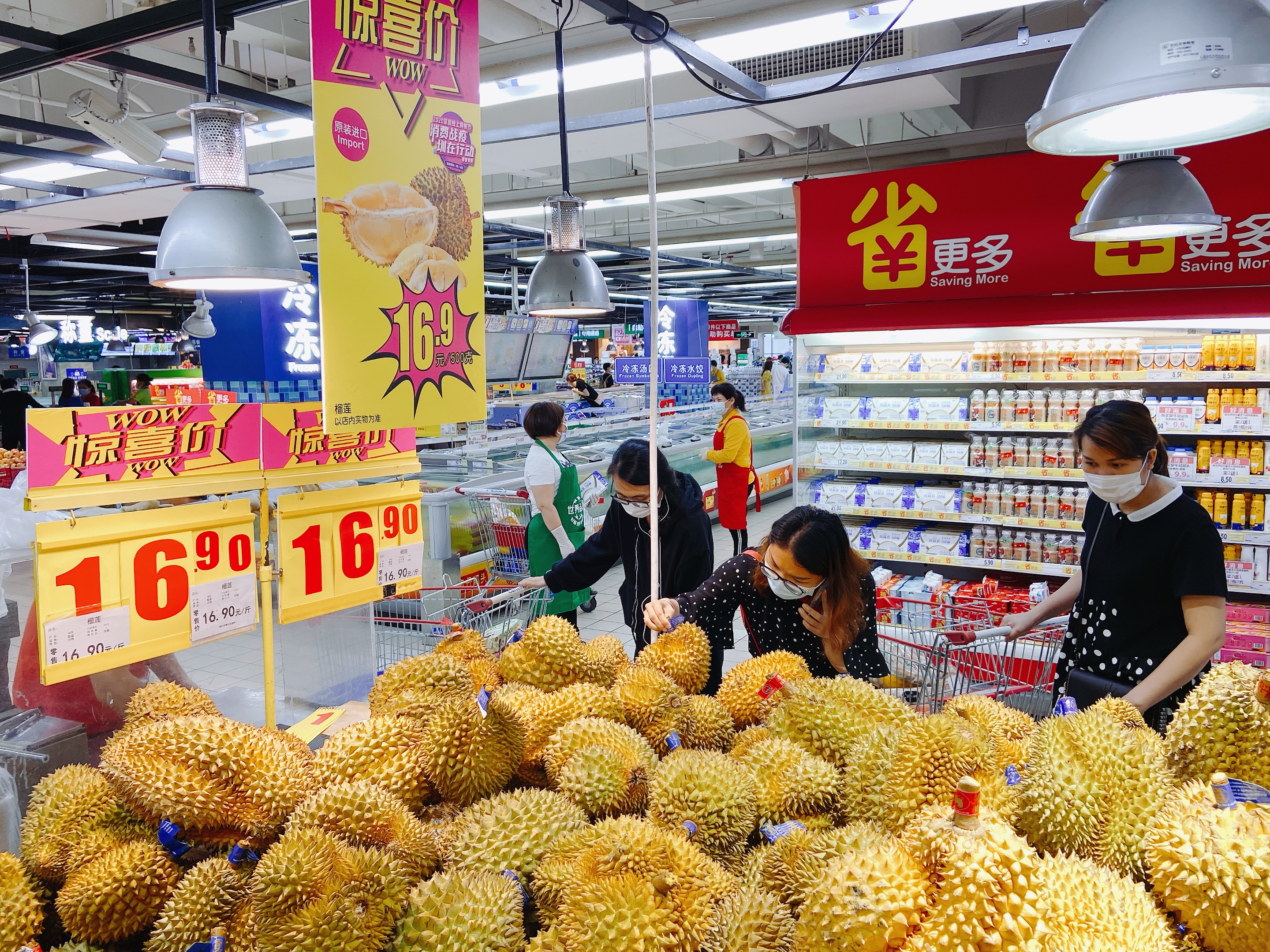 4月19日,記者來到家樂福一門店實地探訪。剛一步入生鮮區(qū)域,便被“泰國進口榴蓮,白菜價16.9一斤”的促銷口號所吸引。整個生鮮區(qū)不乏各色接地氣的促銷口號,吆喝聲此起彼伏,吸引不少消費者駐足選購?!皠偵鲜械奶﹪鹫眍^,你看這個個頭、還有這個味道你聞聞,(每斤)只要16.9,比我們小區(qū)附近的生鮮超市還便宜”,一位受訪者對高性價比的泰國榴蓮贊不絕口。此次探店,記者聽到消費者最多的反饋是“品質(zhì)更好了,品種更多了”。家樂福深諳消費者的需求,想要促進消費,首先要給消費者提供更多更好的選擇?!拔覀冞@次推出的’四月品鮮季’活動,有來自泰國、菲律賓等東南亞國家的反季水果,也有來自巴西、湖北的水產(chǎn)肉類。16.9元一斤的泰國金枕榴蓮、4.9元一斤的菲律賓切割蕉、25.9元一斤的湖北清水稻田蝦這幾天一直占據(jù)暢銷榜前三的位置”,該店負責人介紹。