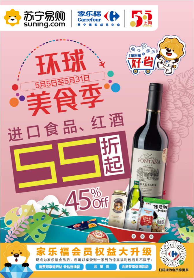 此外,家樂福方面還宣布將加大投入,全面支持上?!拔逦遒徫锕?jié),全城打折季”。5月5日至31日,上海地區(qū)家樂福門店將開啟“環(huán)球美食季”,精選來自法國、意大利、英國、西班牙、美國、加拿大、日本、韓國、馬來西亞等39個國家的350個品牌旗下共計3700多種進口食品,與上海消費者共襄盛舉。美食自然少不了美酒相伴,來自法國、意大利、西班牙、阿根廷、智利、澳洲等國家的70多個品牌旗下共計200多種進口葡萄酒,也將悉數(shù)亮相全市家樂福門店。活動期間,進口食品低至5.5折起,進口紅酒買一送一。進博會“同款”法國奧格斯汀系列葡萄酒也將首次參與促銷,葡萄酒愛好者不容錯過。