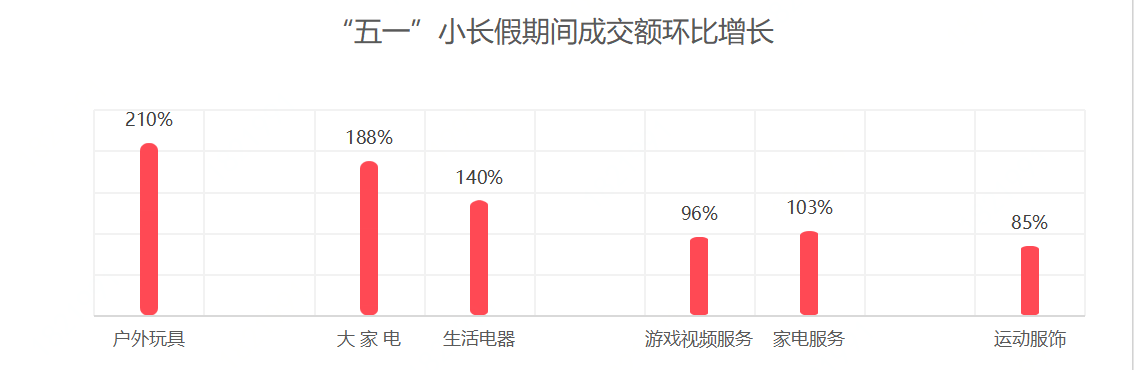 “五一”小長假期間,國產(chǎn)商品的成交額同比增長了52%。國產(chǎn)的生鮮產(chǎn)品十分豐富,農(nóng)產(chǎn)品觸網(wǎng)利用信息經(jīng)濟快速的將地方市場轉(zhuǎn)化為全國市場,成交額同比增長了148%。此外,國產(chǎn)的家電、農(nóng)資園藝、清潔用品及廚具的成交額同比增長較高。