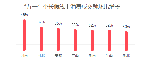 “五一”小長假尤其對河南、河北、安徽等中部省份的線上消費拉動作用更強。由于一線城市的線上消費趨于日?;藗兌嗤獬龌顒?,用親近大自然、戶外活動的方式度過假日。同時,一部分在大城市里工作的人員也在假日返回老家,帶動了中部省份的線上消費。