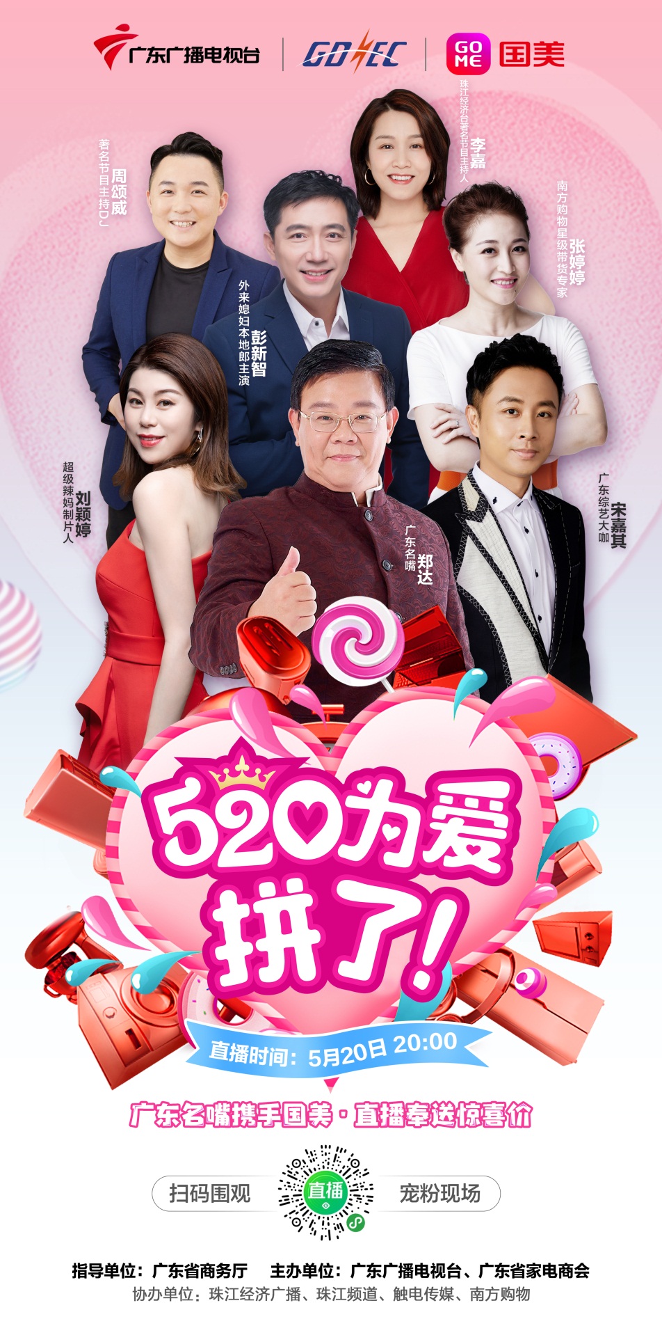 見圳客戶端·深圳新聞網(wǎng)2020年5月15日訊 在廣東省商務(wù)廳指導(dǎo)下,由廣東廣播電視臺(tái)、廣東省家電商會(huì)和華南國(guó)美聯(lián)合舉辦,“520為愛拼了”超級(jí)直播將于5月20日晚8點(diǎn)整驚喜開播!廣東名嘴鄭達(dá)、綜藝大咖宋嘉其、影視演員彭新智攜一眾明星主播為廣東省的街坊們帶來空調(diào)、冰箱、洗衣機(jī)、電視、手機(jī)等大批家電潮品!屆時(shí),主播們不僅給街坊們帶來意想不到的低價(jià),直播中還會(huì)不間斷抽出手機(jī)、家電等大批豪禮,敬請(qǐng)期待!這次直播是全國(guó)首次大小屏同步直播,街坊們不僅可以通過美店商城、看點(diǎn)直播、京東、珠江頻道直播小程序、珠江經(jīng)濟(jì)廣播呼啦直播小程序、南方購物直播小程序、觸電新聞APP等平臺(tái)在線觀看并下單,而且還可以打開南方購物電視頻道下單購買。