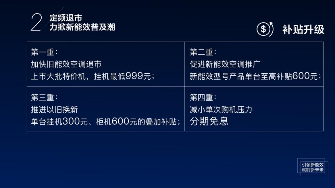同時(shí),“新一級(jí)能效聯(lián)盟”還將持續(xù)開展“空調(diào)節(jié)能風(fēng)暴”等綠色消費(fèi)讓利活動(dòng)。該活動(dòng)涵蓋四重補(bǔ)貼,分別是老能效清倉(cāng)、新能效補(bǔ)貼、以舊換新及分期免息,多管齊下加速新舊能效產(chǎn)品的切換、擴(kuò)大綠色消費(fèi)規(guī)模。