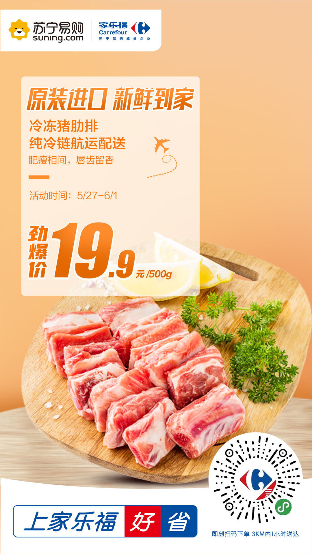 進(jìn)口冷凍豬肋排是本次活動(dòng)的主推爆品之一。生豬按照歐盟標(biāo)準(zhǔn)養(yǎng)殖,采用非轉(zhuǎn)基因飼料喂養(yǎng),全程不使用抗生素,原廠精切,采用純冷鏈航運(yùn)配送,全程可溯源。肥瘦相間,讓人唇齒留香。豬肉價(jià)格高企的背景下,這款進(jìn)口豬肋排原價(jià)39.9元/500g,活動(dòng)期間僅售19.9元/500g,價(jià)格十分惠民,絕對(duì)是秒殺爆品。此外,家樂福還準(zhǔn)備了澳洲黃牛肉36.8元/斤、帶皮后腿肉19.9元/斤、小龍蝦19.9元/盒、波士頓龍蝦+三文魚的組合預(yù)售。誠(chéng)意滿滿,只為滿足“食肉獸”的大胃口!