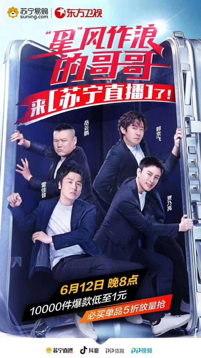 原來(lái),蘇寧將在6月12日晚8點(diǎn)開啟以“星”風(fēng)作浪的哥哥為主題的直播活動(dòng),共計(jì)3個(gè)小時(shí)。正所謂娛樂(lè)購(gòu)物兩不誤,極限挑戰(zhàn)將陣容搬到了直播間,4位明星搭檔主持,帶領(lǐng)用戶感受全方位的品質(zhì)化購(gòu)物,煥新精彩生活。