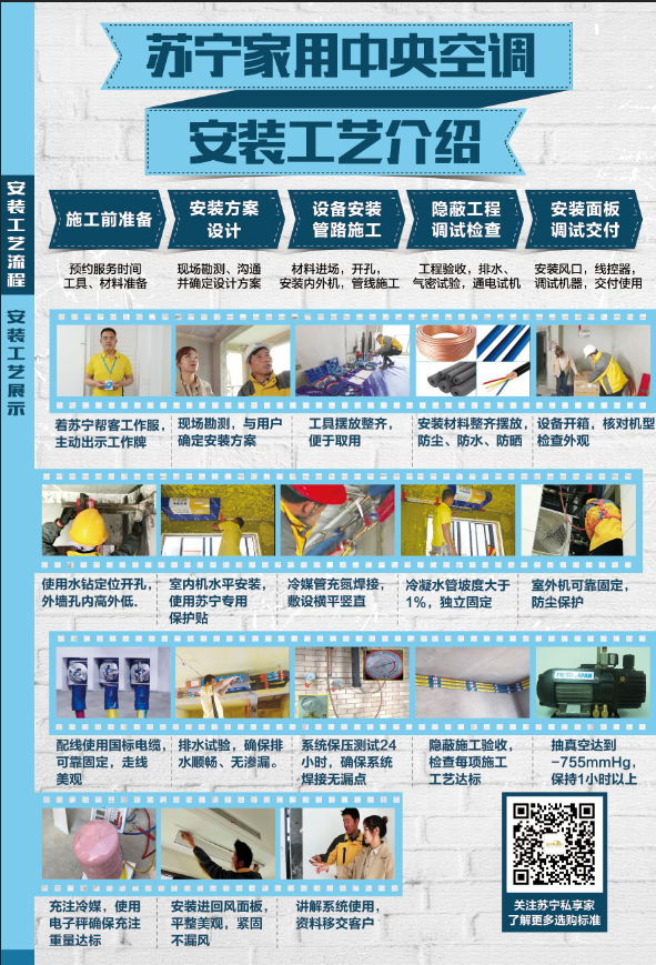 蘇寧中央空調(diào)以《安裝綠寶書》的形式,從“人、材、技”三方面規(guī)定蘇寧施工“365標(biāo)準(zhǔn)”,細(xì)致展示了蘇寧中央空調(diào)的施工流程和具體工藝,包括安裝工程師的職業(yè)行為、施工現(xiàn)場(chǎng)的規(guī)范、安裝工具的要求、安裝材料的標(biāo)準(zhǔn),以及整個(gè)安裝過(guò)程的嚴(yán)苛工藝標(biāo)準(zhǔn)和調(diào)試環(huán)節(jié)等諸多方面。五大工序,涉及18個(gè)步驟,為消費(fèi)者全面解讀中央空調(diào)標(biāo)準(zhǔn)化施工的“秘密”。