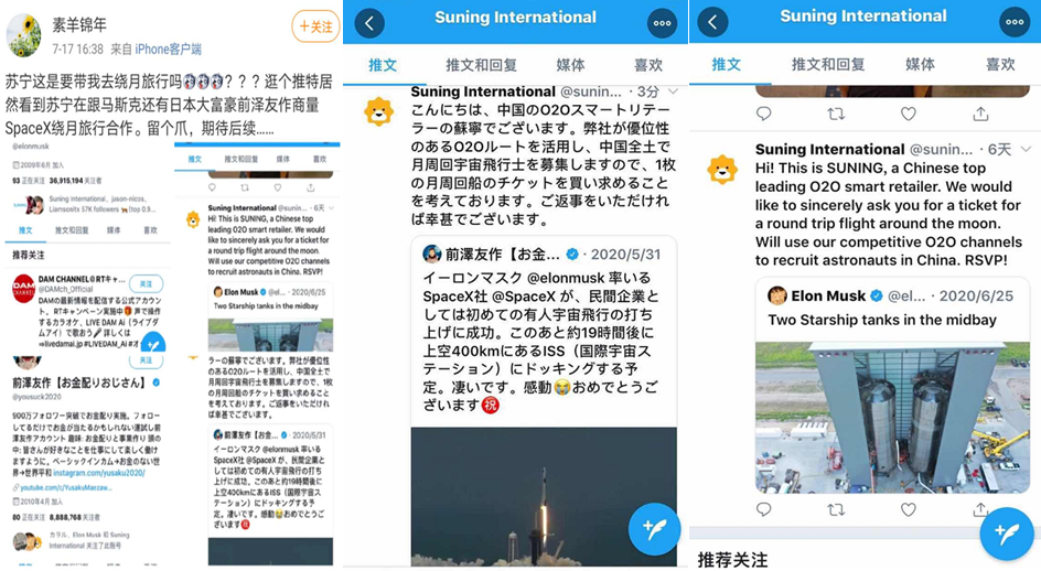 一個(gè)馬斯克,一個(gè)前澤友作,這趟萬(wàn)眾矚目的繞月之旅原本跟我們國(guó)內(nèi)是沒(méi)什么關(guān)系的,但因?yàn)樘K寧的出現(xiàn)突然有了轉(zhuǎn)機(jī)。有微博用戶爆料,蘇寧7月中時(shí)候就在推特向馬斯克及前澤友作分別拋出合作求繞月旅行船票的橄欖枝。