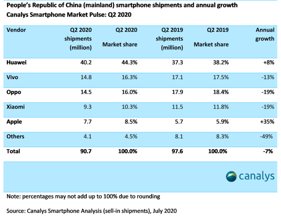 見(jiàn)圳客戶端·深圳新聞網(wǎng)2020年8月3日訊 知名調(diào)研公司Canalys發(fā)布的最新數(shù)據(jù)顯示,盡管與2019年第二季度相比市場(chǎng)萎縮了7%,但中國(guó)智能手機(jī)市場(chǎng)的季度環(huán)比增長(zhǎng)了25%,在2020年第二季度達(dá)到9000多萬(wàn)臺(tái)。