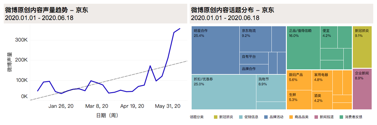 6月與疫情相關(guān)的話題內(nèi)容已降至全部話題的3%,表明用戶(hù)對(duì)疫情的關(guān)心已逐漸轉(zhuǎn)回到京東平臺(tái)核心功能上,即平臺(tái)的電商本質(zhì)。在用戶(hù)體驗(yàn)方面的反饋中,提及“京東值得信賴(lài)”的內(nèi)容占比近45%。京東在疫情爆發(fā)期間包括物資捐贈(zèng),醫(yī)療物資運(yùn)輸?shù)仍趦?nèi)的舉措使京東得到了社交媒體用戶(hù)的肯定與贊揚(yáng)。在618購(gòu)物節(jié)開(kāi)始后,用戶(hù)對(duì)京東平臺(tái)的討論也更多集中在“平臺(tái)大”、“信得過(guò)”等方面。