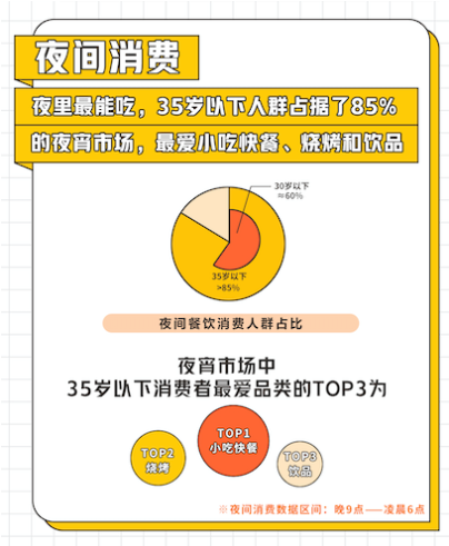 夜間消費(fèi)在周末餐飲消費(fèi)中備受年輕人青睞?!?020周末餐飲堂食消費(fèi)趨勢(shì)洞察》顯示,35歲以下群體是周末夜間消費(fèi)的主力,占比近九成,且最?lèi)?ài)小吃快餐、燒烤和飲品三大品類(lèi)。