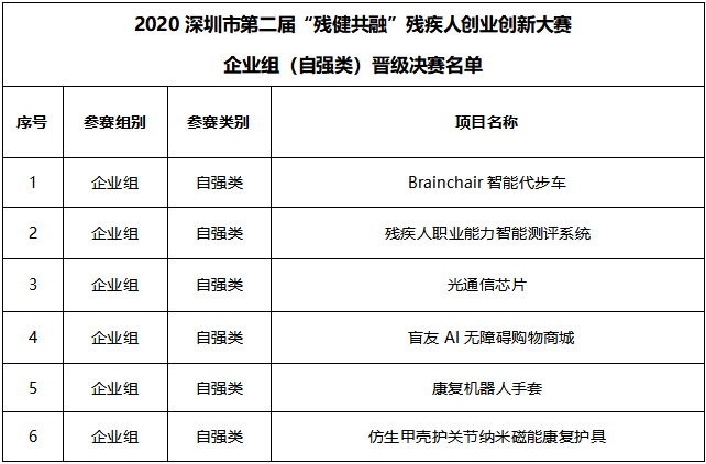 2020深圳市第二屆“殘健共融”殘疾人創(chuàng)業(yè)創(chuàng)新大賽團(tuán)隊組(自強(qiáng)類)晉級決賽名單