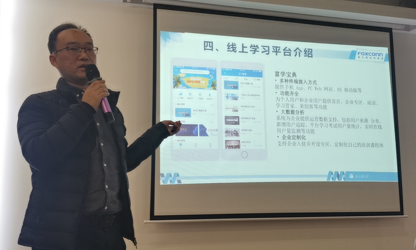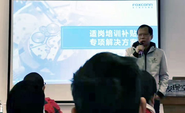 富士康大學(xué)資深專理李治佑帶來了適崗培訓(xùn)補補貼的專項解決方案,李專理表示,富士康大學(xué)會開放更多的課程資源,賦能富友制造企業(yè),促進灣區(qū)制造企業(yè)筑基升級。