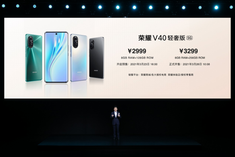 榮耀V40輕奢版擁有幻夜黑、藍(lán)水翡翠和鈦空銀三種配色,提供8GB+128GB、8GB+256GB兩個(gè)內(nèi)存版本,售價(jià)分別為2999元和3299元。3月26日10:08在線上線下全平臺開售,用戶可通過榮耀商城及各大授權(quán)電商平臺或前往榮耀線下體驗(yàn)店、榮耀授權(quán)零售門店進(jìn)行購買。