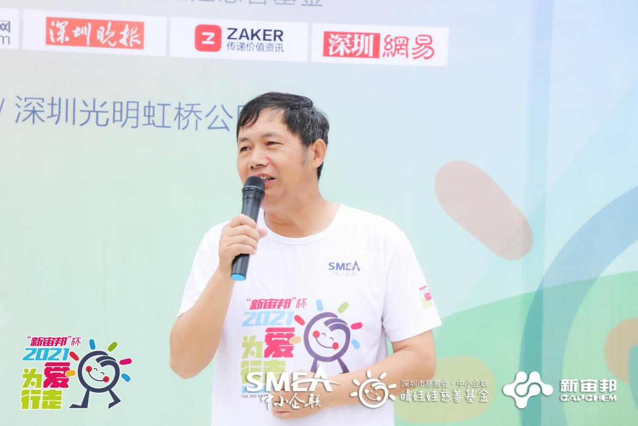 深圳中小企聯(lián)會(huì)長、深圳市杰科電子有限公司董事長黃榮添為開幕式致辭。他表示:“感謝新宙邦對本次慈善公益徒步活動(dòng)做出的貢獻(xiàn),以及今天參加此次活動(dòng)的愛心企業(yè)家、愛心人士們的大力支持,我代表深圳中小企聯(lián)感謝大家的參與,今后也希望通過各類活動(dòng)讓更多愛心人士關(guān)注我們“晴娃娃”,給更多的孩子送去關(guān)愛,能讓他們綻放開心的笑容?!?/p>