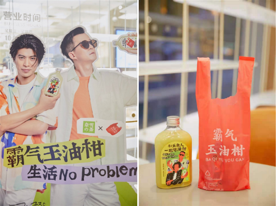 對于品牌×明星的聯(lián)名來說,調(diào)性契合是聯(lián)名活動不可或缺的"出圈基因"。而奈雪的茶霸氣玉油柑與樂隊(duì)五條人,看似來自不同次元,實(shí)則都有大膽、堅(jiān)持、向上、樂觀的底色,而非將不搭嘎的兩個品牌生硬地“拉郎配”。奈雪還圍繞聯(lián)名別出心裁地推出了五條人主題的立牌、貼紙和堆頭,甚至將五條人標(biāo)志性的“紅色塑料袋”做成了極具個性且生物可降解的奈雪打包袋,可謂細(xì)節(jié)之處見真章。