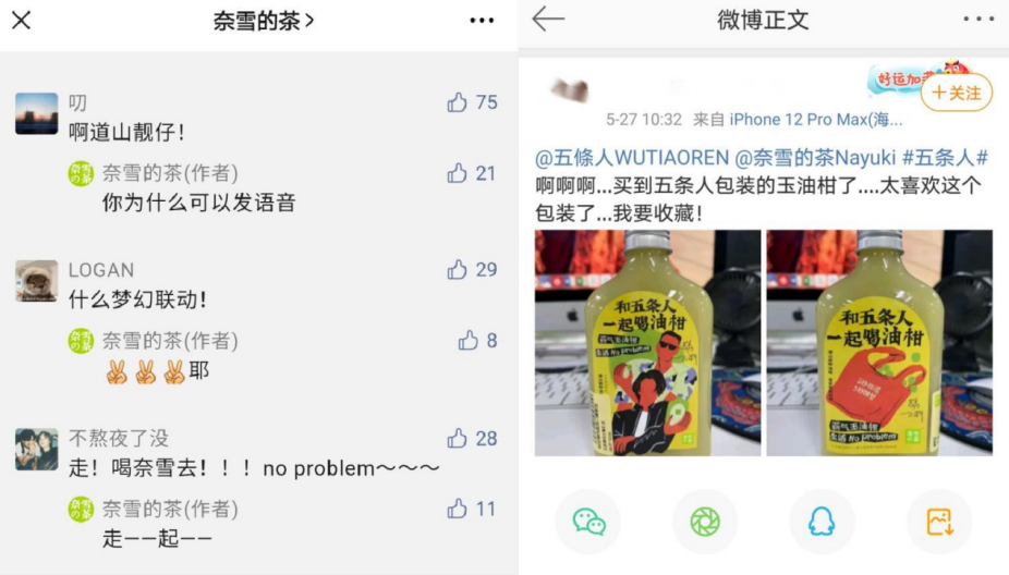 這樣“肆意妄為”的話從五條人嘴里蹦出并不稀奇,他們與生俱來的“平凡生活浪漫主義”,擅長洞察事物的另一面。精妙的是,奈雪的茶洞察到用戶在日常生活中的種種焦慮,將霸氣玉油柑“先澀后甜”的特點(diǎn)比作人生滋味,用這一豁達(dá)積極的態(tài)度來輕松正能量地引導(dǎo),這一點(diǎn)與五條人的精神內(nèi)核如出一轍。5月27日奈雪的茶X五條人TVC發(fā)布后,不少網(wǎng)友表示這波是“破次元壁”的夢幻聯(lián)動,還有網(wǎng)友在線分享五條人歌曲中有共鳴的歌詞。
