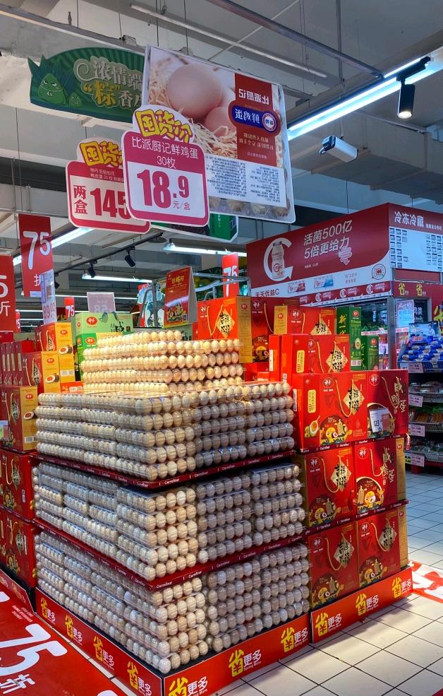 記者在走訪家樂福發(fā)現(xiàn),各大品牌的咸鴨蛋禮盒、粽子禮盒都已經(jīng)陸續(xù)上市。在咸鴨蛋禮盒中,神丹20枚皮蛋贅婿聯(lián)名款和神丹18枚青殼咸鴨蛋兩款禮盒都備受歡迎。