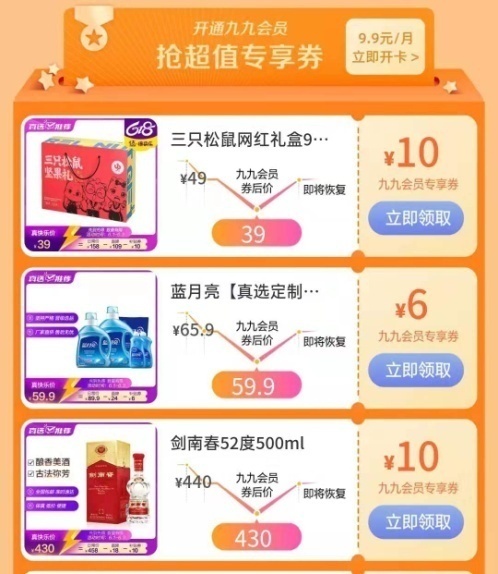 活動(dòng)期間,九九會(huì)員可搶專享大額券,大牌網(wǎng)紅爆品狂歡底價(jià)。三只松鼠網(wǎng)紅堅(jiān)果禮盒998g*2券后價(jià)39元,藍(lán)月亮洗衣液禮包券后價(jià)59.9元,劍南春52度500ml酒券后價(jià)430元......實(shí)實(shí)在在讓用戶買到“真低價(jià)”,買的“真值得”!
