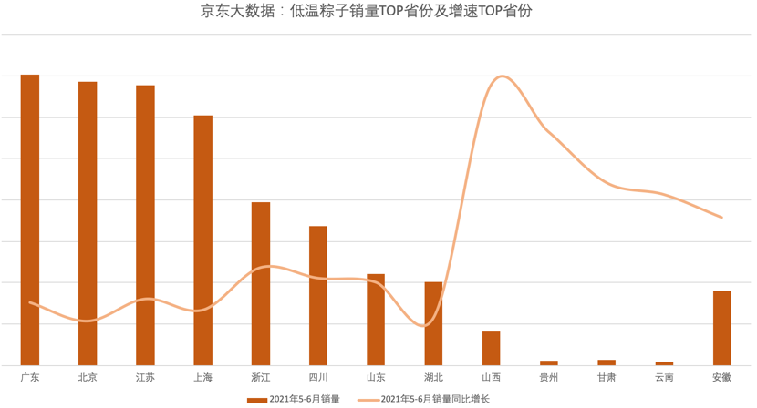 與低溫發(fā)展趨同的,還有平臺助力食品企業(yè)數(shù)字化和渠道完善帶來的整個(gè)行業(yè)對下沉市場的發(fā)掘——從銷量看北京、廣東及江浙滬等發(fā)達(dá)地區(qū)是低溫粽子的主要消費(fèi)區(qū)域,四川、山東、湖北等省緊隨其后。而隨著京東冷鏈和物流的下沉和完善,山西、貴州、甘肅、云南、安徽等省區(qū)的增速位列全國前五。