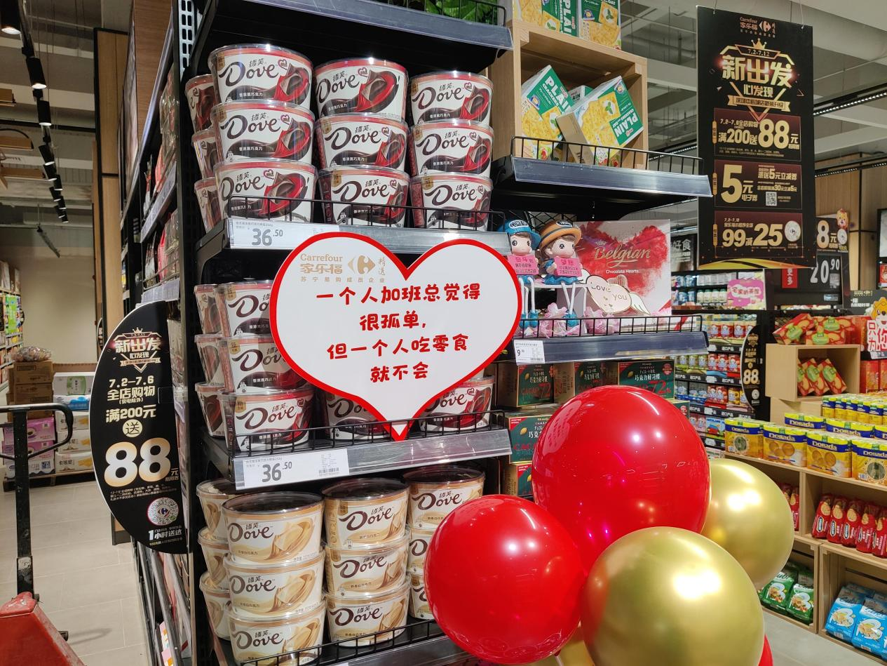 借著盛大開(kāi)業(yè)的東風(fēng),家樂(lè)福社區(qū)品質(zhì)中心店推出了“優(yōu)品物語(yǔ)”的趣味逛店活動(dòng)。該活動(dòng),在原本干巴巴的價(jià)格指示牌下面增加了諸如,“一個(gè)人吃飯很孤單,但一個(gè)人吃零食就不會(huì)”“隔壁的,你和卷心菜是什么關(guān)系?我是反內(nèi)卷菜系”“櫻桃:要我一口能讓你大紅”“藍(lán)莓:我還爆漿!能讓你大紫”等“Z世代”語(yǔ)言,吸引大家來(lái)發(fā)掘逛超市的趣味。不但年輕的小情侶可以在下班后默契地相視一笑,也吸引到小紅書(shū)的博主們競(jìng)相探店打卡。既賦予了購(gòu)物一點(diǎn)有趣和人性化,也給這屆年輕人動(dòng)輒發(fā)圈、種草的社交型消費(fèi)加點(diǎn)料。