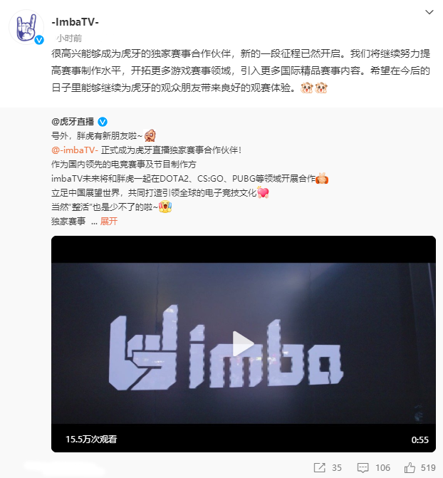 本次虎牙公司和imbaTV達(dá)成合作,不僅能加強(qiáng)雙方在DOTA2、CS:GO、PUBG等品類賽事上的優(yōu)勢(shì),也與虎牙對(duì)電競(jìng)賽事多元布局的計(jì)劃高度契合。