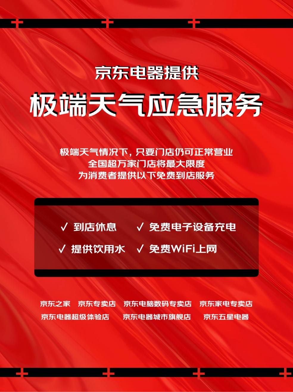 京東電器第一時(shí)間推出了極端天氣應(yīng)急服務(wù),聯(lián)動當(dāng)?shù)厝钥烧I業(yè)的京東之家、京東專賣店、京東電腦數(shù)碼專賣店等線下門店,為市民提供汛情避險(xiǎn)場所和應(yīng)急服務(wù)。未來在遇到極端天氣的情況下,京東電器在全國的線下門店,包括京東之家、京東專賣店、京東電腦數(shù)碼專賣店、京東家電專賣店、京東電器超級體驗(yàn)店、京東電器城市旗艦店、京東五星電器等門店只要仍可正常營業(yè),將最大限度為附近的消費(fèi)者提供到店休息、飲用水、電子設(shè)備充電、 WiFi上網(wǎng)等免費(fèi)應(yīng)急服務(wù)。