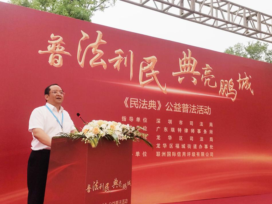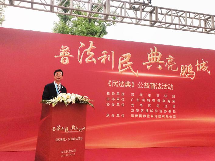 讀特客戶端·深圳新聞網(wǎng)2021年7月29日訊 (記者 常軍平) 昨日,由深圳市司法局指導(dǎo)、廣東瑞特律師事務(wù)所主辦、龍華區(qū)司法局、龍華區(qū)福城街道辦事處、深圳潮青會(huì)協(xié)辦、聯(lián)洲國際信用評(píng)級(jí)有限公司承辦的“普法利民,典亮鵬城”《民法典》公益普法活動(dòng)在龍華舉行。
