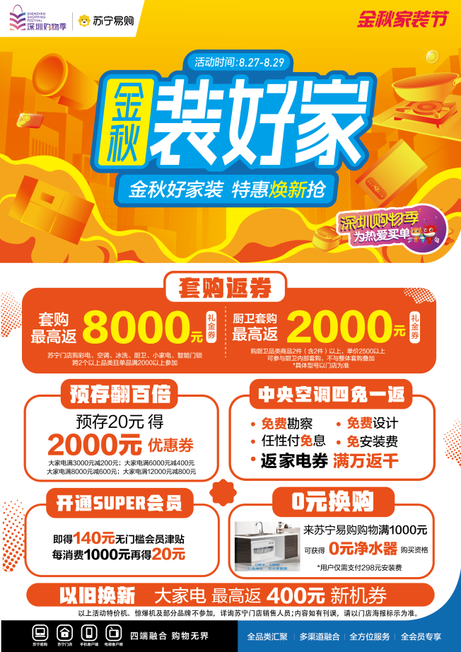 而9月9日到9月12日期間,蘇寧易購將開啟涉及全品類的金秋家裝節(jié),并且將會聯(lián)合海信一起開啟909嗨購盛典,屆時不僅會有大牌匯聚,福利補貼,還將會有家裝品牌共同加入,聯(lián)手提供一站式裝修解決方案,一同為消費者避開家裝過程中的那些坑。同時深圳購物季也在持續(xù)進行中,蘇寧易購作為指定電商平臺,為深圳市提供了一億元的消費補貼,消費者在深圳市蘇寧易購門店參與以舊換新活動,大家電產(chǎn)品最高可以補貼400元,手機產(chǎn)品最高可以補貼1600元,電腦產(chǎn)品最高享受88折優(yōu)惠。另外蘇寧易購還開設(shè)了“圳品專區(qū)”,里面匯聚深圳本土大牌產(chǎn)品,折扣低至五折起。