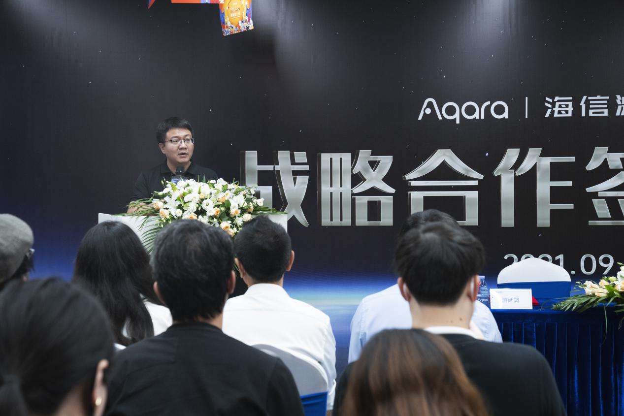 致辭環(huán)節(jié),海信集團(tuán)控股公司副總裁于芝濤也發(fā)來(lái)了線上祝福視頻,表達(dá)了對(duì)這次雙方合作,共同致力全屋智能美好體驗(yàn)再升級(jí)的美好祝愿。與此同時(shí),青島海信激光顯示股份有限公司的副總經(jīng)理王偉介紹了海信電視在戰(zhàn)略發(fā)展方向上的重塑新定位、新技術(shù)應(yīng)用、產(chǎn)品優(yōu)勢(shì)以及所取得的階段性成就等,并表示Aqara作為全球智慧生活方式的先行者和引領(lǐng)者,致力于打造「千人千面」的全屋智能生活方式,要做更懂用戶的“家”,這和海信電視“顯示無(wú)處不在,服務(wù)無(wú)處不在,連接無(wú)處不在”的發(fā)展理念不謀而合。除去智能化,雙方與生俱來(lái)的“綠色基因”更加夯實(shí)了這種合作契因,并始終堅(jiān)信,未來(lái)海信電視與Aqara將會(huì)不斷用綠色智能科技提升大家的家居生活品質(zhì),打造大屏?xí)r代的綠色客廳,引領(lǐng)中國(guó)IoT的發(fā)展。