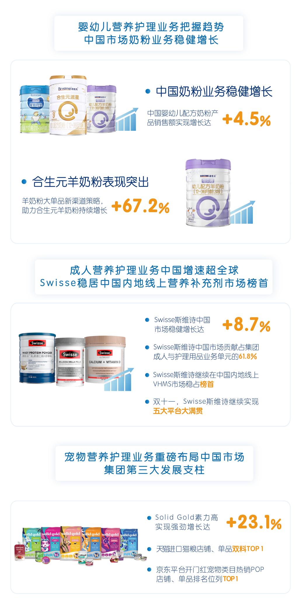 其中,嬰幼兒營養(yǎng)及護理用品業(yè)務單元(BNC)中的中國市場奶粉業(yè)務銷售額實現(xiàn)4.5%增長;成人營養(yǎng)及護理用品業(yè)務單元(ANC)銷售額全球升勢明顯,達5.8%,其中ANC中國市場增幅達8.7%;寵物營養(yǎng)及護理用品業(yè)務單元(PNC)營收達3.45億元,Solid Gold素力高同比增長達23.1%, PNC中國市場在PNC業(yè)務單元占比41.1%。