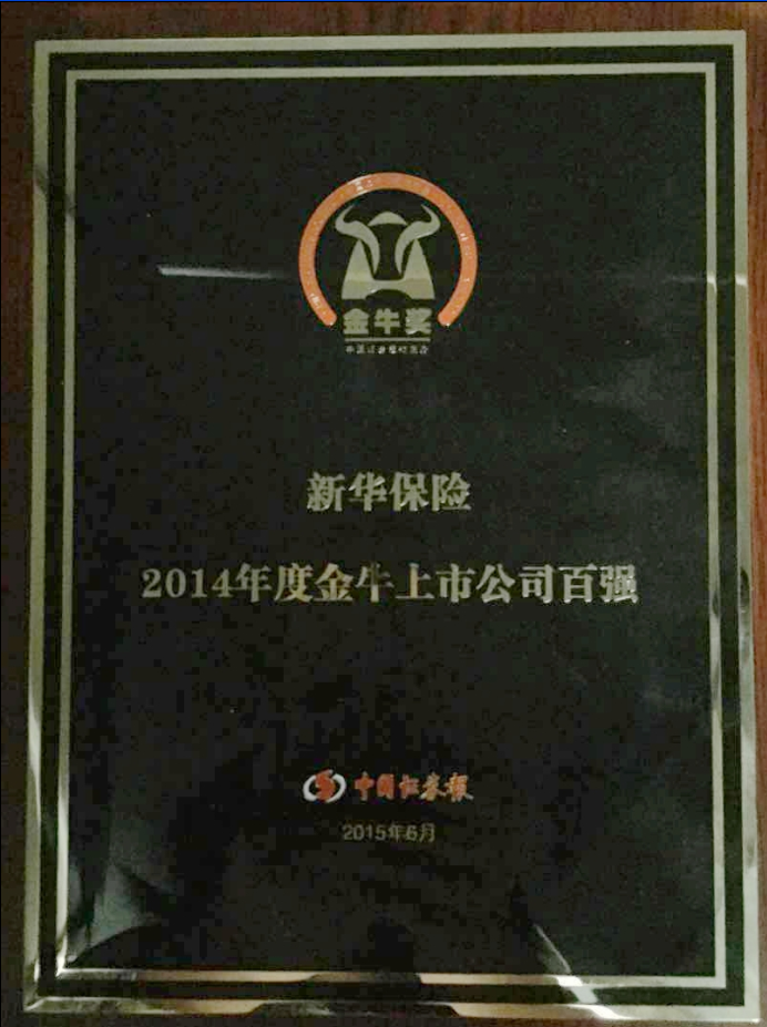 ?2015年6月,中國證券報(bào)第17屆(2014年度)上市公司金牛獎(jiǎng)隆重揭曉,新華保險(xiǎn)榮獲“金牛上市公司百強(qiáng)”獎(jiǎng)項(xiàng),這代表了資本市場(chǎng)以及社會(huì)各界對(duì)新華保險(xiǎn)在公司治理、信息披露、投資者關(guān)系等方面工作的高度認(rèn)可。