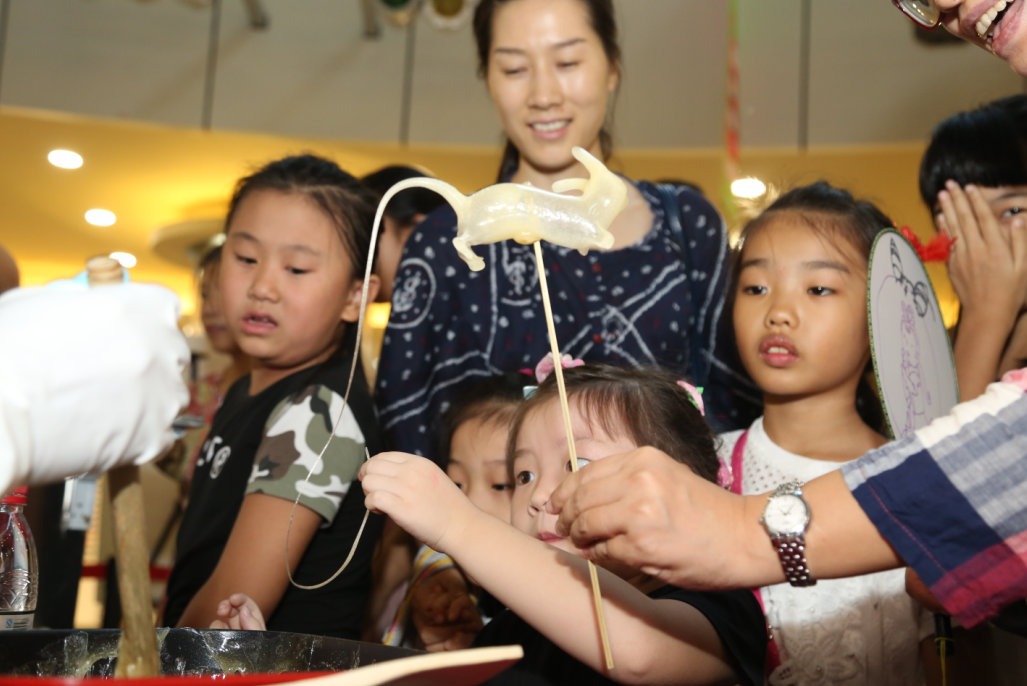 現(xiàn)場,糖人制作師傅安靜地坐在展臺前,任人群在身邊走走停停,埋頭專注捏著各式形狀。只見他用竹篾緩緩攪拌麥芽糖,挖出一團(tuán)放在手里揉捏拉扯,做出一個小管子,抿嘴往里吹氣,麥芽糖慢慢膨脹并逐漸變成透明,再迅速捏出頭和腳,一只糖老鼠便活靈活現(xiàn)地被“吹”了出來?!疤衿媪?,麥芽糖在叔叔手中變成了‘活’的,沒想到傳統(tǒng)手工藝如此出神入化?!?0歲的玥玥瞧得津津有味,她說,比起逛商場和游樂場,這樣的體驗活動不僅能感受到中華傳統(tǒng)文化,還可以學(xué)到很多課本以外的知識。
