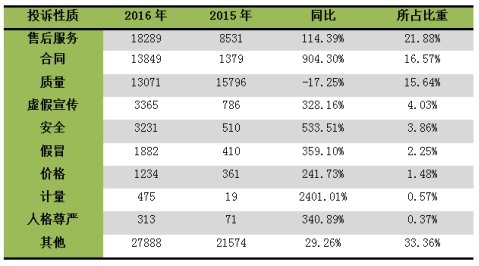 由于投訴總量的激增,相對于2015年,除質(zhì)量問題之外,其他各類的投訴問題都增加,增加的幅度大多超過了1倍。如表3,圖4所示。
