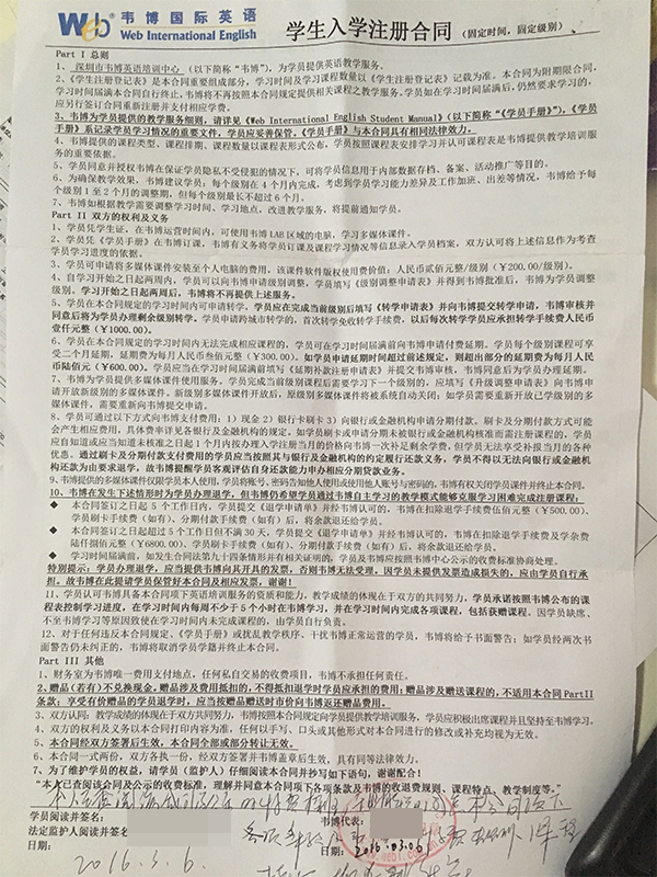 6節(jié)課,花費34800元 投訴深圳市韋博國際英語培訓中心單方合同條款,忽視消費者權益。