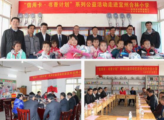 在2015年12月9日的信用卡發(fā)卡儀式上,深圳農(nóng)商行承諾客戶(hù),持卡人每用深圳農(nóng)商行信用卡完成1筆交易,深圳農(nóng)商行就捐出0.1元,用于支援偏遠(yuǎn)貧困地區(qū)學(xué)校圖書(shū)室建設(shè)。涓涓細(xì)流,匯成大海,本次活動(dòng)受到廣大客戶(hù)的踴躍參與和2016年,由深圳農(nóng)商行發(fā)起的“信用卡公益計(jì)劃·書(shū)香圖書(shū)室”捐贈(zèng)活動(dòng),深入走進(jìn)廣西壯族自治區(qū)的偏遠(yuǎn)山區(qū),為當(dāng)?shù)剌^為貧困的學(xué)校學(xué)生送去溫暖。極支持。深圳農(nóng)商行“信用卡公益計(jì)劃·書(shū)香圖書(shū)室”活動(dòng)的目標(biāo)是在全國(guó)建立100個(gè)圖書(shū)室,捐贈(zèng)10萬(wàn)冊(cè)圖書(shū),希望能為孩子們的教育和成長(zhǎng)貢獻(xiàn)一份力量。