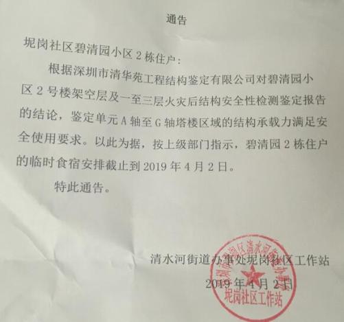 據(jù)記者從坭崗社區(qū)工作站公告了解到,經(jīng)專業(yè)鑒定樓房結(jié)構(gòu)承載力滿足安全使用要求,因此,碧清園2棟住戶的臨時食宿安排截止到4月2日。對于居民提出的室內(nèi)燒焦氣味的安全問題,通告內(nèi)容未作出解釋。