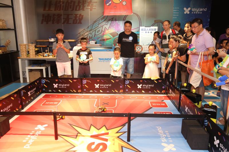 “我跟你說噢,那邊吹出來的泡泡能把我們倆都包進去!”“老媽,原來空氣的形狀是圓環(huán)形的呀……”歡聲笑語中,十幾項科技趣味項目讓小朋友們眼花繚亂、目不暇接,這其中,機器人對抗賽無疑是人氣最高的。賽場上,小朋友們分為紅藍兩隊,手持遙控器在兩側站好。“小朋友們注意啦,每一位機器人身上有一個藍色燈柱,碰撞擋板被撞到后,燈柱長度會縮短……”老師一邊在“戰(zhàn)場”中擺放機器人,一邊為孩子們詳細講解規(guī)則。一聲哨響,紅藍兩隊的“機器人大戰(zhàn)”拉開了帷幕,孩子們操控著自己的戰(zhàn)車,左右閃躲,時而用一個漂亮的側移甩掉追擊者,時而全力沖擊消耗對方的“藍條”。賽場邊的家長們似乎比小選手更為緊張,他們時不時俯下身子,為孩子們出謀劃策:“小超你看,邊上那個三號車藍條快沒了,快趕過去補一下!”一位父親看到了打破僵局的好機會,急忙提醒道,小朋友則心領神會,熟練的操縱著機器人貼了上去……經(jīng)過一番努力,在成功拿下這寶貴的一分后,小朋友回頭與自己的老爸相視一笑,父子二人之間的默契,在這一刻體現(xiàn)的淋漓盡致。