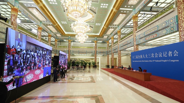 2020年5月28日(星期四)下午十三屆全國(guó)人大三次會(huì)議閉幕后,國(guó)務(wù)院總理李克強(qiáng)在人民大會(huì)堂三樓金色大廳出席記者會(huì)并回答中外記者提問。為有效防控疫情,共同維護(hù)公共衛(wèi)生與健康,記者會(huì)采用網(wǎng)絡(luò)視頻形式進(jìn)行。新華網(wǎng)、中國(guó)政府網(wǎng)進(jìn)行現(xiàn)場(chǎng)直播。 [2020-05-2814:00 ]