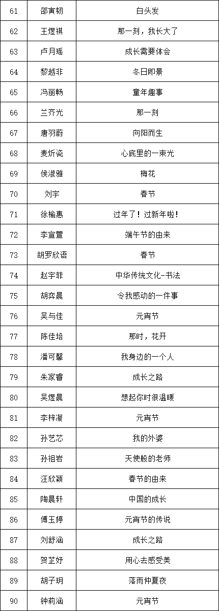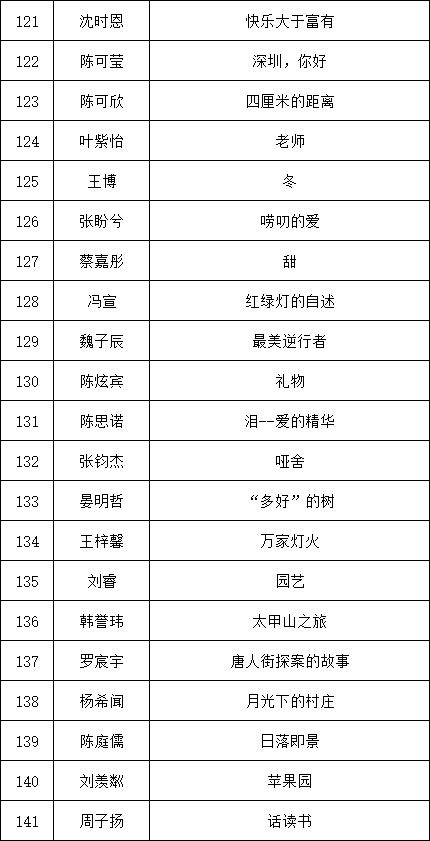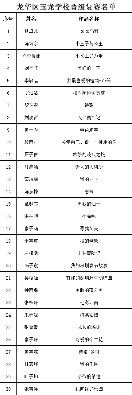 自2021年1月,活動征稿啟動以來,獲得了深圳市廣大中小學生、教師、文學愛好者的熱烈響應(yīng)積極參與,吸引了深圳百余所學校的上萬人關(guān)注報名?,F(xiàn)公布龍華區(qū)玉龍學校專場晉級復賽名單如下: