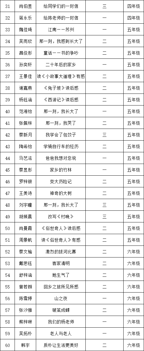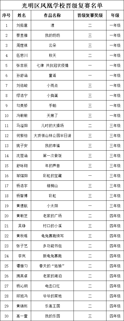 自2021年1月,活動(dòng)征稿啟動(dòng)以來,獲得了深圳市廣大中小學(xué)生、教師、文學(xué)愛好者的熱烈響應(yīng)積極參與,吸引了深圳百余所學(xué)校的上萬人關(guān)注報(bào)名?,F(xiàn)公布深圳市光明區(qū)鳳凰學(xué)校專場晉級(jí)復(fù)賽名單如下: